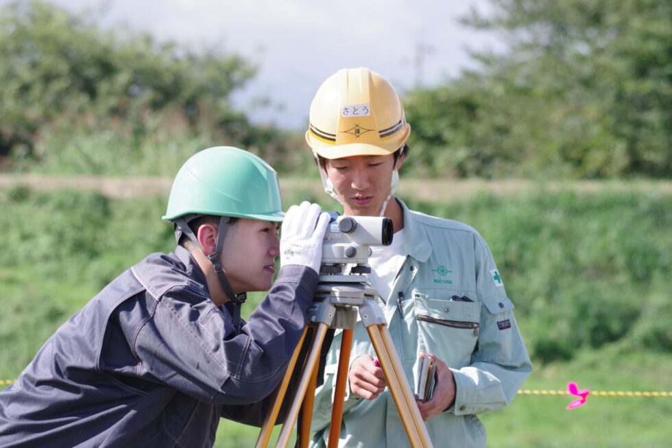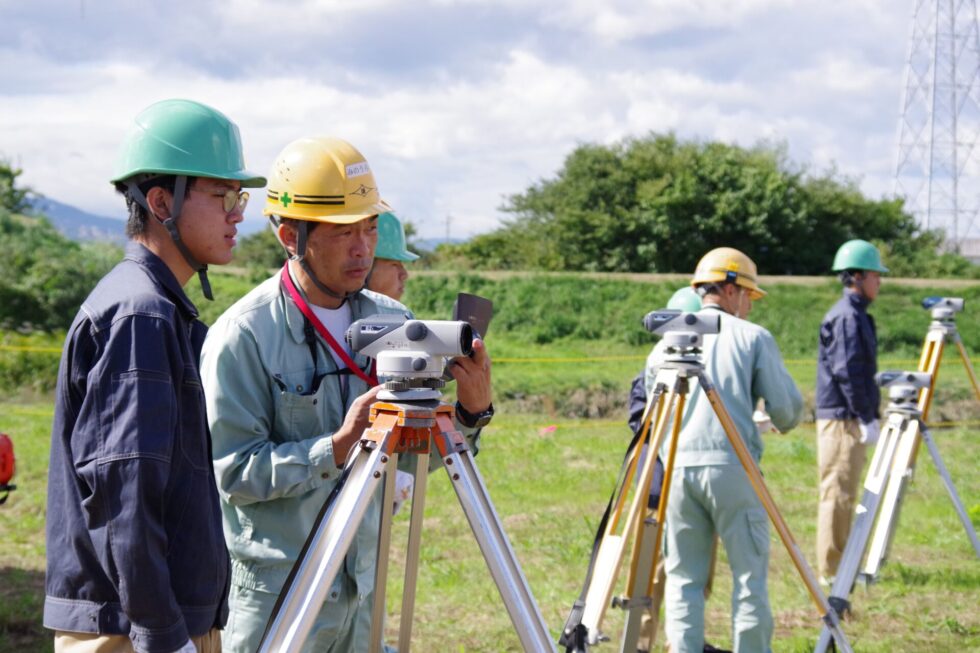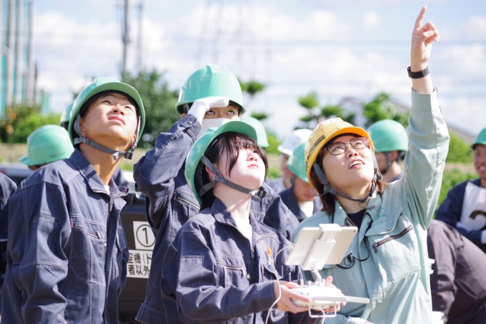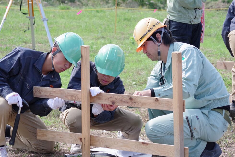 工事概要の説明後、丁張設置やドローン操作、トータルステーションによる測量体験等、実際行っている施工管理の仕事を体験してもらいました。